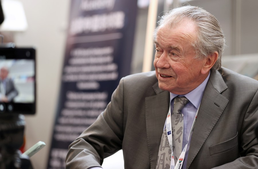 British sociologist Martin Albrow is interviewed after his new book's launch ceremony in London, Britain, April 6, 2022. (Xinhua/Li Ying)