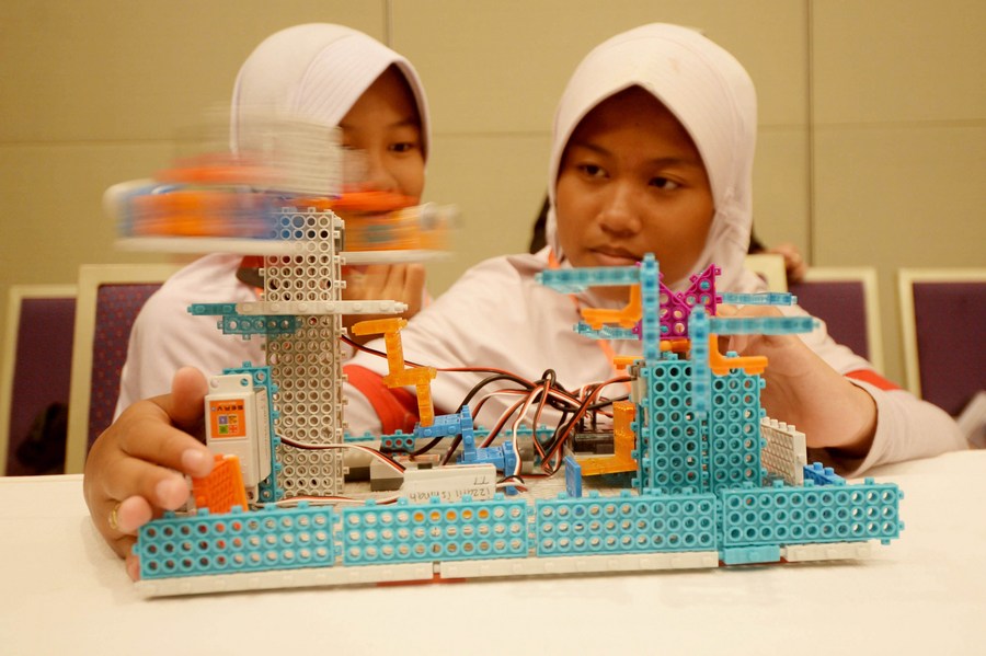 Two girls prepare their robot during the Indonesian Youth Robotic Competition (IYRC) in South Tangerang, Indonesia, April 22, 2018. (Xinhua/Agung Kuncahya B.)