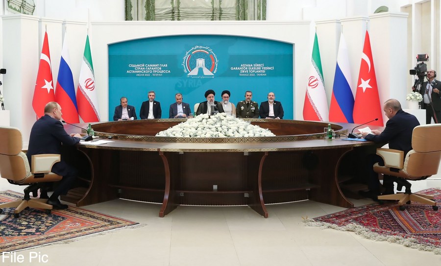 Iranian President Ebrahim Raisi (C), Russian President Vladimir Putin (1st L) and Turkish President Recep Tayyip Erdogan (R, Front) attend a trilateral meeting on the situation in Syria, in Tehran, Iran, on July 19, 2022. (Iranian Presidential Website/Handout via Xinhua)