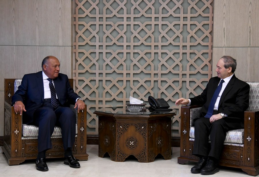 Syrian Foreign Minister Faisal Mekdad (R) holds talks with visiting Egyptian Foreign Minister Sameh Shoukry in Damascus, Syria, Feb. 27, 2023. (Photo by Ammar Safarjalani/Xinhua)
