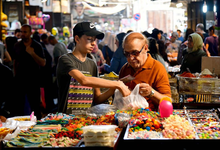 People buy sweets for the upcoming Eid al-Adha, also known as the Feast of the Sacrifice, at Buzouriyeh in Damascus, Syria, July 4, 2022. (Photo by Ammar Safarjalani/Xinhua)