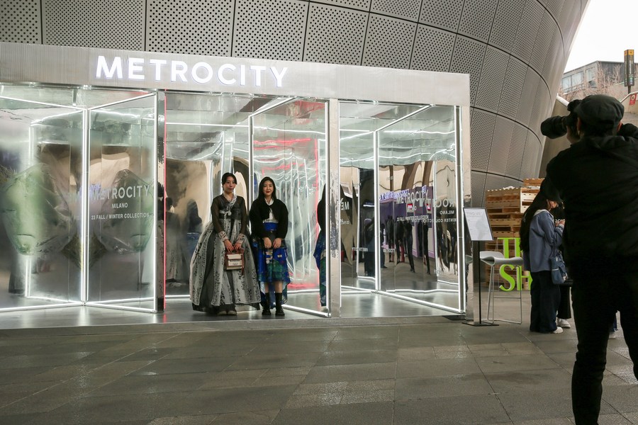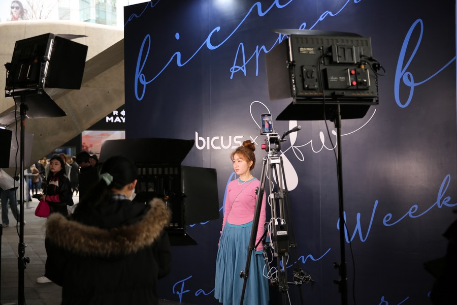 People pose for photos during the 2023 Fall/Winter Seoul Fashion Week in Seoul, South Korea on March 15, 2023. (Xinhua/Wang Yiliang)