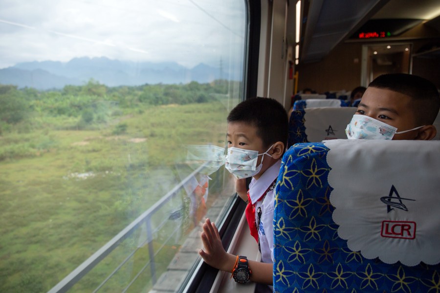 Students from the China-Laos Friendship Nongping Primary School are seen on the Lane Xang EMU train in Laos, Dec. 1, 2022. (Photo by Kaikeo Saiyasane/Xinhua)