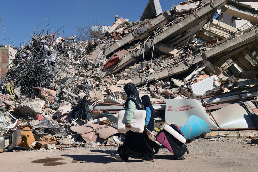 People walk past a collapsed building in Adiyaman, Türkiye, Feb. 18, 2023. (Photo by Mustafa Kaya/Xinhua)