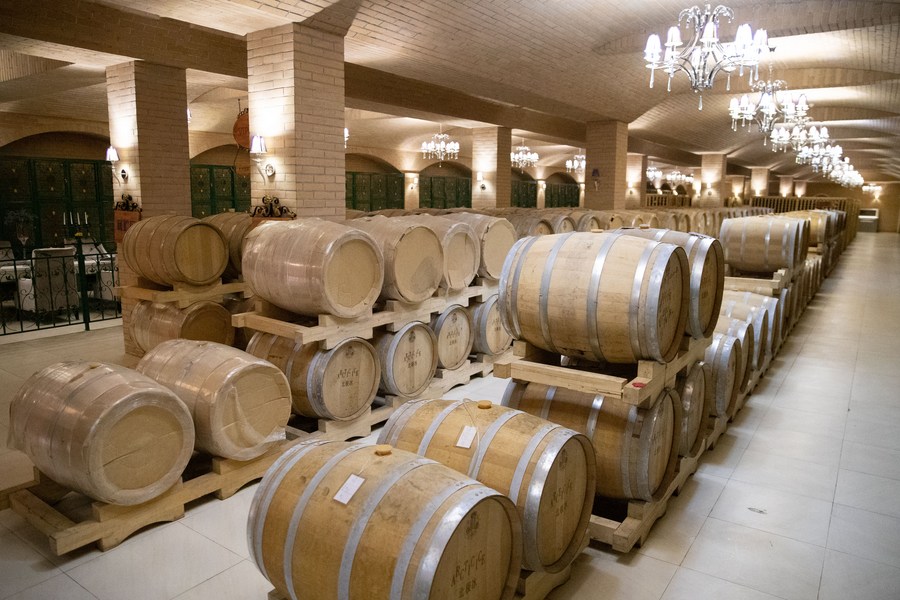 This photo taken on March 16, 2023 shows blueberry wine made from wild blueberries being stored in wine cellar of a blueberry winery in the Greater Khingan Range, northeast China's Heilongjiang Province. (Xinhua/Zhang Tao)