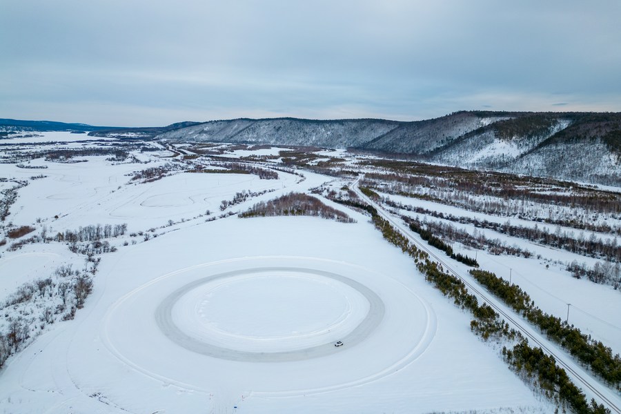 This aerial photo taken on March 17, 2023 shows a vehicle undergoing a cold resistance test at a test base in Mohe, northeast China's Heilongjiang Province. (Xinhua/Zhang Tao)