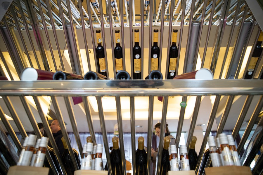 Tourists buy blueberry wine in a blueberry winery in the Greater Khingan Range, northeast China's Heilongjiang Province, March 16, 2023. (Xinhua/Zhang Tao)