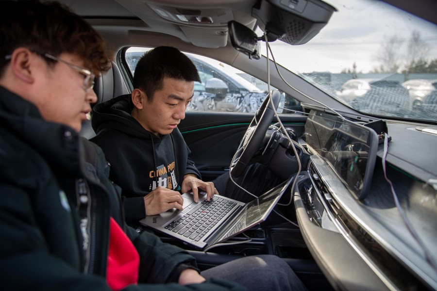 Staff members modify the data of a vehicle at a test base in Mohe, northeast China's Heilongjiang Province, March 17, 2023. (Xinhua/Zhang Tao)