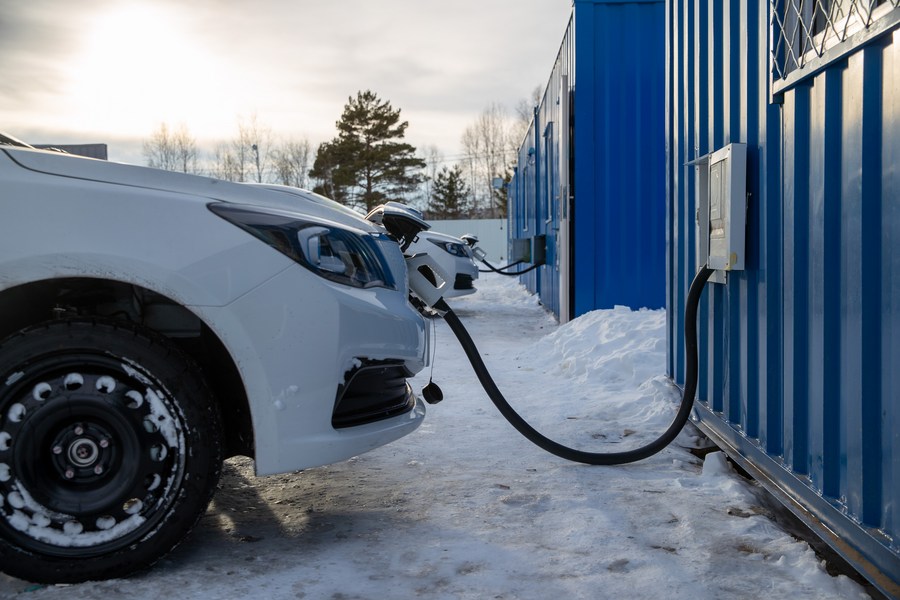 Vehicles are charged at a test base in Mohe, northeast China's Heilongjiang Province, March 17, 2023. (Xinhua/Zhang Tao)