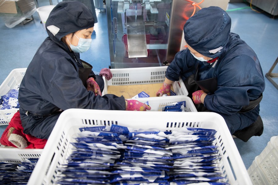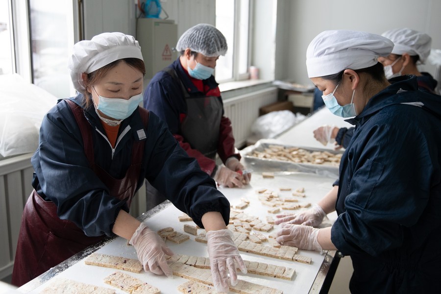 Workers pack products at a workshop of a food processing firm in the Greater Khingan Range, northeast China's Heilongjiang Province, March 15, 2023. (Xinhua/Zhang Tao)