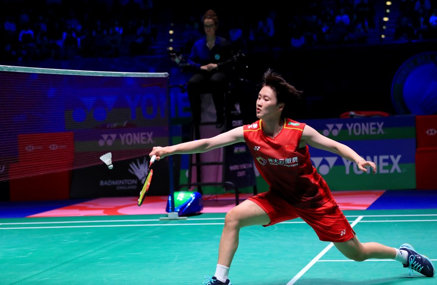 China's Chen Yufei returns a shot during the women's semifinal against Japan's Akane Yamaguchi at All England Open Badminton Championships 2023 in Birmingham, Britain, March 18, 2023. (Xinhua/Li Ying)