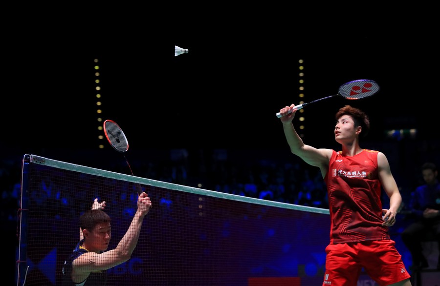 China's Shi Yuqi (R) returns a shot during the men's semifinal against Malaysia's Lee Zii Jia at All England Open Badminton Championships 2023 in Birmingham, Britain, March 18, 2023. (Xinhua/Li Ying)