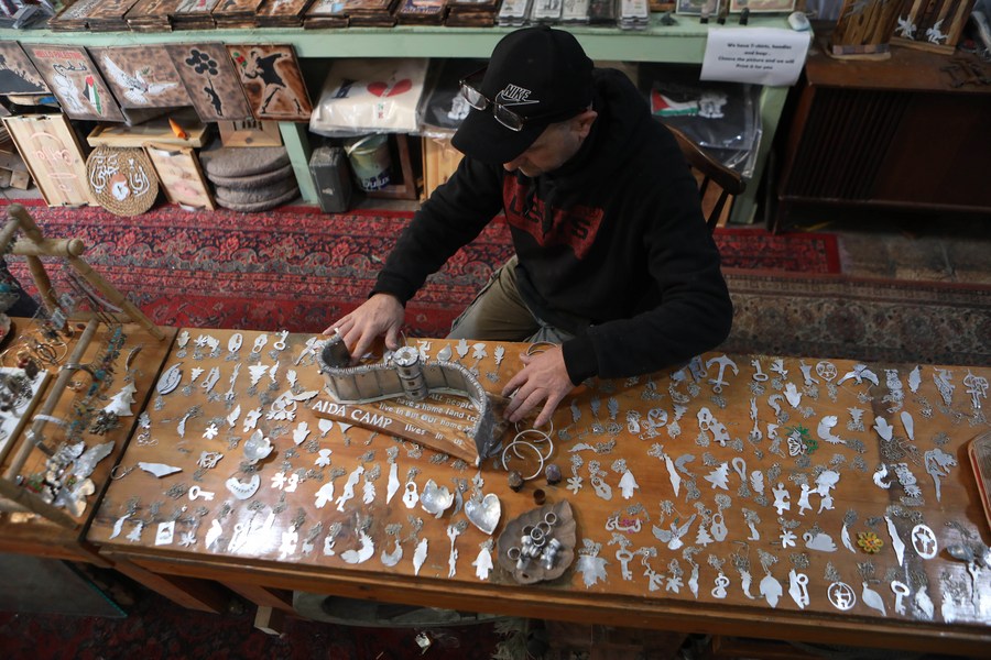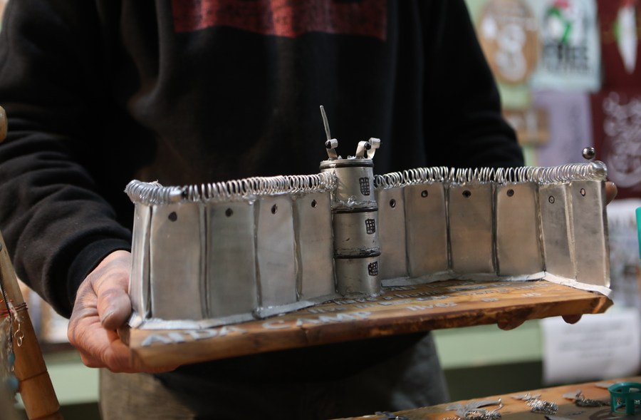 Palestinian artist Akram al-Wa'ra displays an art piece which he made of tear gas canisters at his workshop in the Aida refugee camp in the West Bank city of Bethlehem, on Feb. 2, 2023.(Photo by Mamoun Wazwaz/Xinhua)
