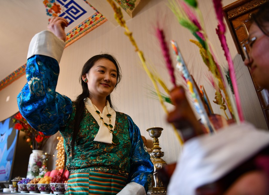A woman in traditional costume eats chema, roasted barley and fried wheat grain in a two-tier rectangular wooden box, to celebrate the Tibetan New Year in Lhasa, southwest China's Tibet Autonomous Region, Feb. 21, 2023. (Xinhua/Jigme Dorje)