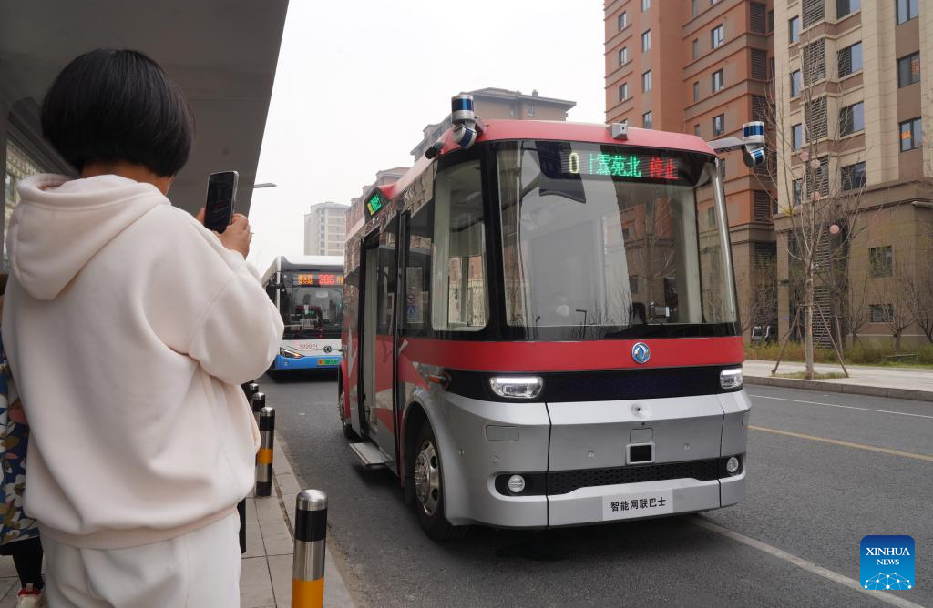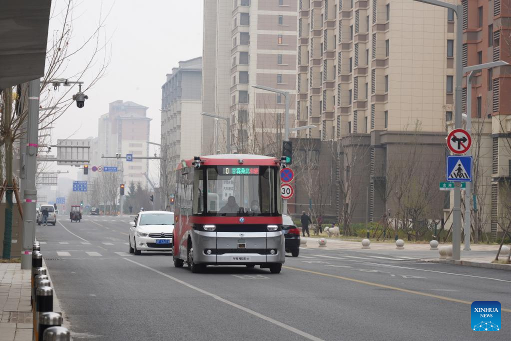 An intelligent connected bus approaches a stop during a trial operation on a street in Rongdong area of Xiong'an New Area, north China's Hebei Province, March 20, 2023. This self-driving passenger bus is equipped with high-precision sensors including laser radars, millimeter-wave radars, and HD cameras, and capable of making operational decisions in one tenth seconds. It can also cope with adverse weather conditions and complicate traffic situations. (Xinhua/Mu Yu)