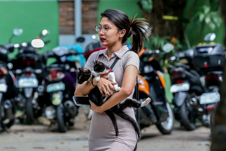 A woman takes her pet cat to receive a free rabies vaccination during the national rabies awareness month in Quezon City, the Philippines, March 20, 2023.(Xinhua/Rouelle Umali)