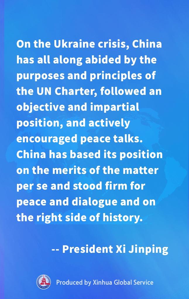 -- Last month, China released a document titled "China's Position on the Political Settlement of the Ukraine Crisis," Xi stressed, adding that on the Ukraine crisis, China has all along abided by the purposes and principles of the UN Charter, followed an objective and impartial position, and actively encouraged peace talks. China has based its position on the merits of the matter per se and stood firm for peace and dialogue and on the right side of history, he added.