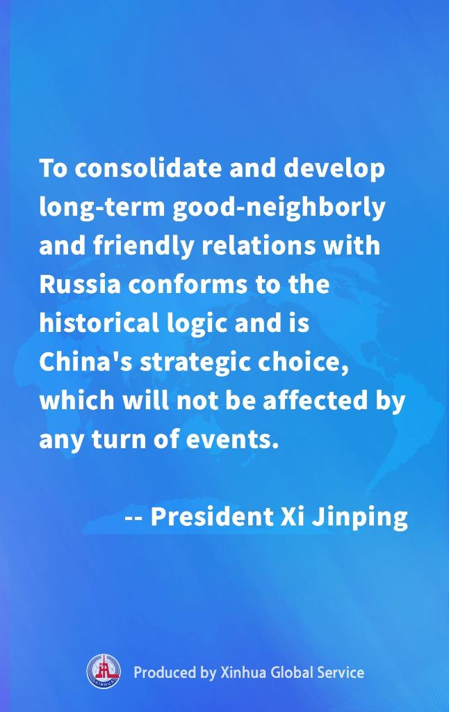 -- Noting that China and Russia are each other's largest neighbor, Xi said that to consolidate and develop long-term good-neighborly and friendly relations with Russia conforms to the historical logic and is China's strategic choice, which will not be affected by any turn of events.