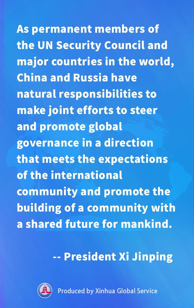 -- Xi noted that changes unseen in a century are evolving faster and the international balance of power is undergoing a profound shift. As permanent members of the UN Security Council and major countries in the world, China and Russia have natural responsibilities to make joint efforts to steer and promote global governance in a direction that meets the expectations of the international community and promote the building of a community with a shared future for mankind.
