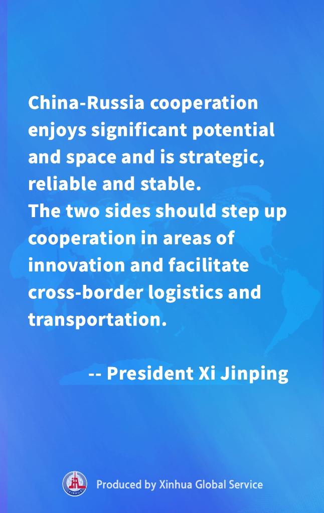 -- Noting China-Russia cooperation enjoys significant potential and space and is strategic, reliable and stable, Xi said that the two sides need to strengthen overall coordination, boost trade in traditional areas, such as energy, resources, and electromechanical products, continuously enhance the resilience of industrial and supply chains, expand cooperation in such areas as information technology, the digital economy, agriculture and trade in services. They should step up cooperation in areas of innovation and facilitate cross-border logistics and transportation, he added.