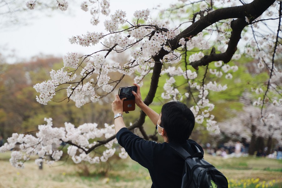 A visitor takes photos of cherry blossoms on the day of the spring equinox at Yoyogi Park in Tokyo, Japan, March 21, 2023. (Xinhua/Zhang Xiaoyu)