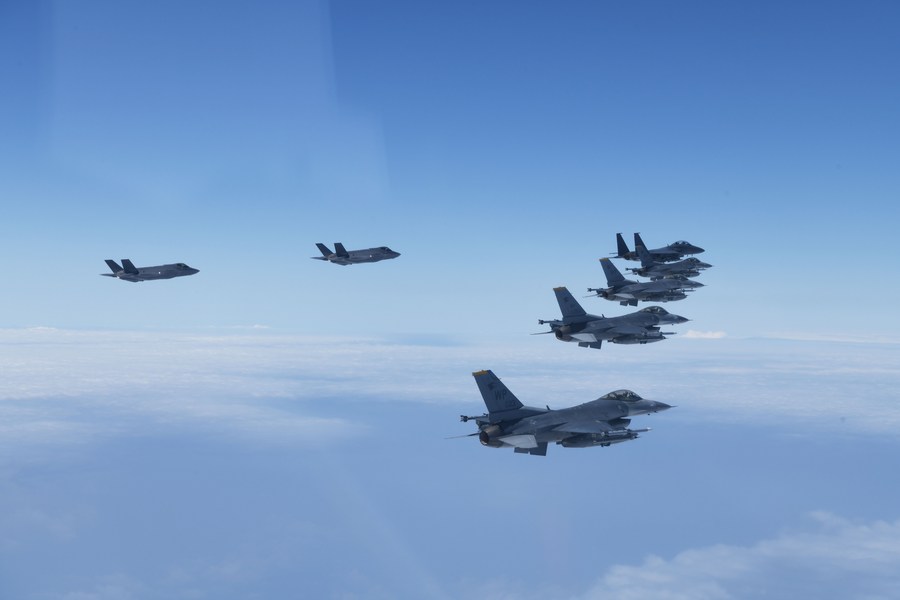 Fighter jets of South Korea and the United States take part in a joint air maneuver exercise over the western waters of South Korea on June 7, 2022. (ROK Ministry of National Defense/Handout via Xinhua)