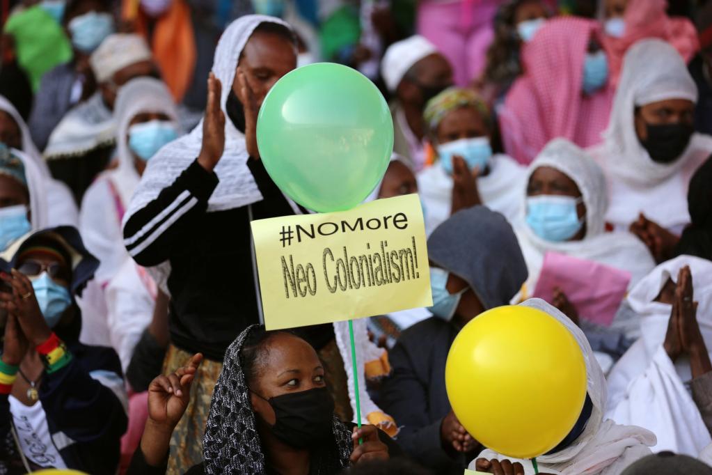The file photo shows people participating in a rally to condemn the Tigray People's Liberation Front (TPLF) and Western intervention in the internal affairs of Ethiopia in Addis Ababa, Ethiopia, on Dec. 5, 2021. (Xinhua/Wang Ping)