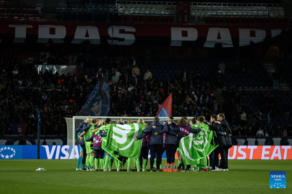 Team VfL Wolfsburg celebrate after winning the UEFA Women's Champions League quarterfinals first leg match between Paris Saint-Germain and VfL Wolfsburg at Parc des Princes stadium in Paris, France, on March 22, 2023. (Photo by Aurelien Morissard/Xinhua)