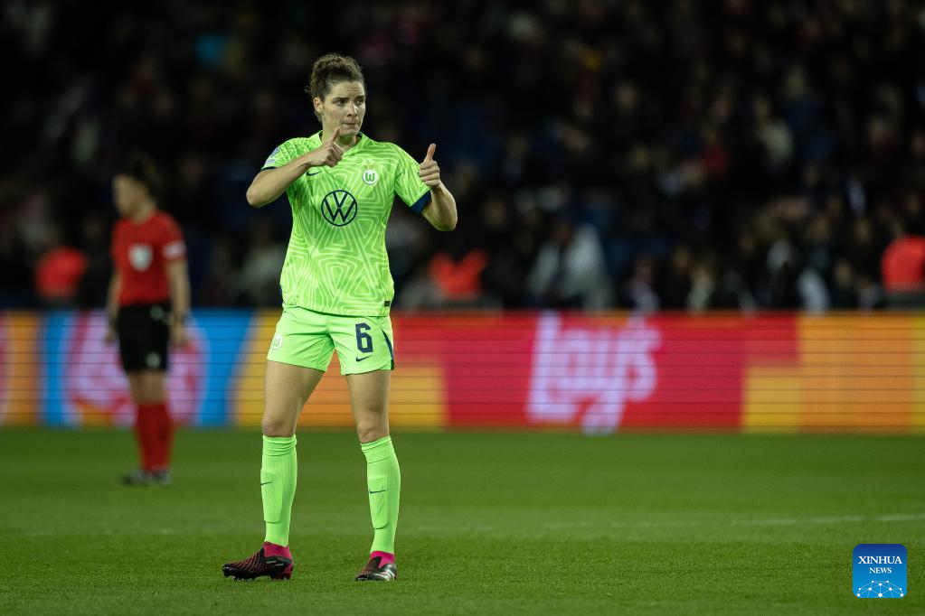 Dominique Janssen (front) of VfL Wolfsburg competes during the UEFA Women's Champions League quarterfinals first leg match between Paris Saint-Germain and VfL Wolfsburg at Parc des Princes stadium in Paris, France, on March 22, 2023. (Photo by Aurelien Morissard/Xinhua)