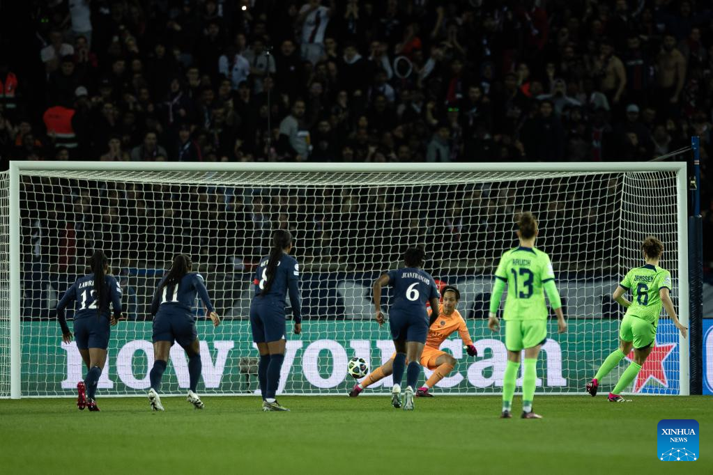 Dominique Janssen (1st R) of VfL Wolfsburg scores a penalty goal during the UEFA Women's Champions League quarterfinals first leg match between Paris Saint-Germain and VfL Wolfsburg at Parc des Princes stadium in Paris, France, on March 22, 2023. (Photo by Aurelien Morissard/Xinhua)
