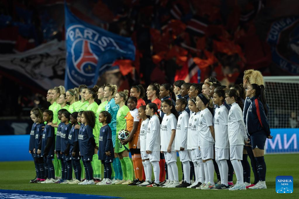 Players line up prior to the UEFA Women's Champions League quarterfinals first leg match between Paris Saint-Germain and VfL Wolfsburg at Parc des Princes stadium in Paris, France, on March 22, 2023. (Photo by Aurelien Morissard/Xinhua)