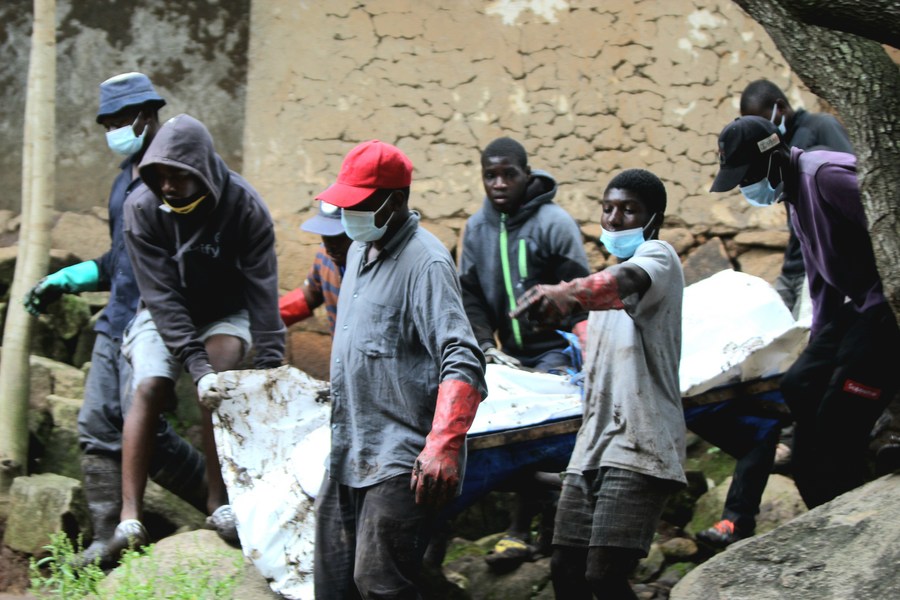 People carry a body during search and rescue work in Blantyre, Malawi, on March 17, 2023. (Photo by Joseph Mizere/Xinhua)