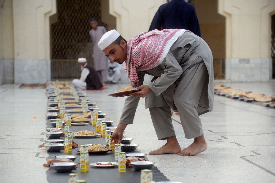 A man arranges food for Iftar on the first day of the holy month of Ramadan in Peshawar, Pakistan on March 23, 2023. (Photo by Umar/Xinhua)