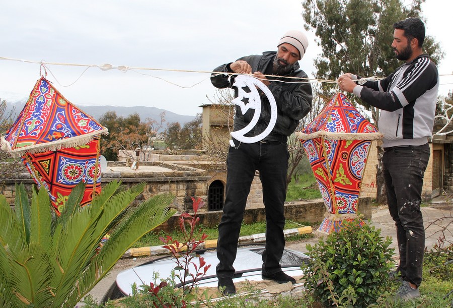Workers hang lanterns and decorations on the first day of the Muslim holy month of Ramadan in Marjayoun, southern Lebanon, March 23, 2023. (Photo by Taher Abu Hamdan/Xinhua)