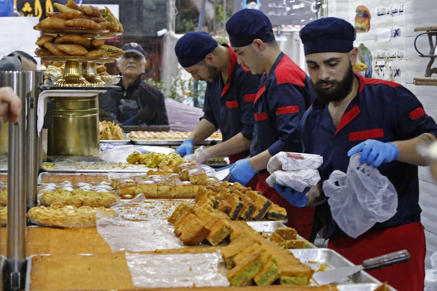 Workers prepare sweets on the first day of the Muslim holy month of Ramadan at a sweet shop in Beirut, Lebanon, March 23, 2023. (Xinhua/Bilal Jawich)