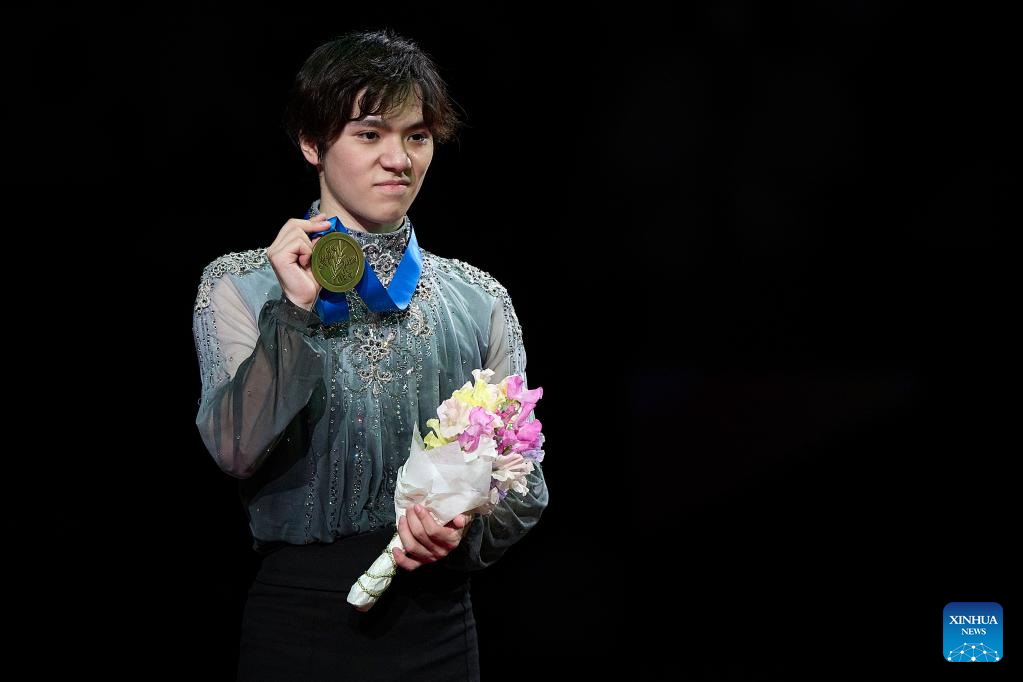 Gold medalist Uno Shoma of Japan poses for photos during the men's awarding ceremony at the ISU World Figure Skating Championships at Saitama Super Arena in Saitama, Japan, March 25, 2023. (Photo by Pablo Morano/Xinhua)