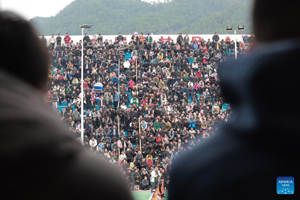 Villagers watch the third-place match between Team Tongren and Team Bijie in Taipan Village, Taijiang County, southwest China's Guizhou Province, March 26, 2023. "Village Basketball Association" or "Village BA", is a grassroot basketball tournament held in Taipan Village. Organized by local residents, this event has gained popularity over the years and draws a large crowd of spectators and participants alike. The tournament showcases the passion and skills of basketball players from rural areas, as they compete and demonstrate their teamwork on the court. (Xinhua/Ou Dongqu)