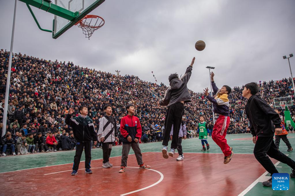 Teenagers play basketball in Taipan Village, Taijiang County, southwest China's Guizhou Province, March 25, 2023. "Village Basketball Association" or "Village BA", is a grassroot basketball tournament held in Taipan Village. Organized by local residents, this event has gained popularity over the years and draws a large crowd of spectators and participants alike. The tournament showcases the passion and skills of basketball players from rural areas, as they compete and demonstrate their teamwork on the court. (Xinhua/Liu Xu)