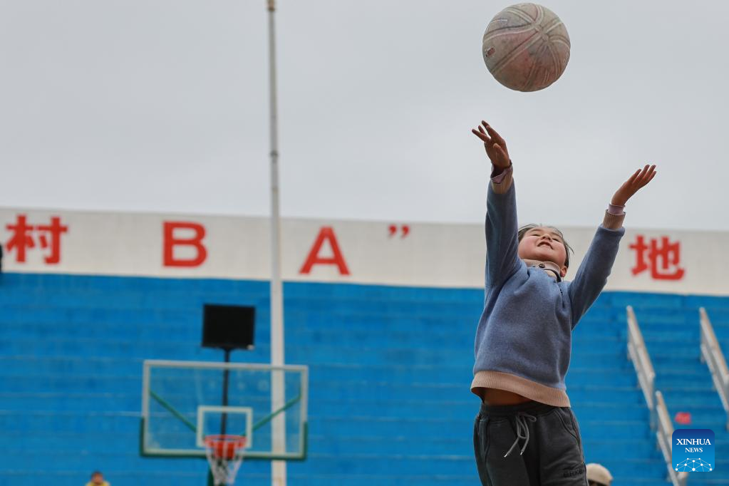 Kids play basketball in Taipan Village, Taijiang County, southwest China's Guizhou Province, March 25, 2023. "Village Basketball Association" or "Village BA", is a grassroot basketball tournament held in Taipan Village. Organized by local residents, this event has gained popularity over the years and draws a large crowd of spectators and participants alike. The tournament showcases the passion and skills of basketball players from rural areas, as they compete and demonstrate their teamwork on the court. (Xinhua/Ou Dongqu)