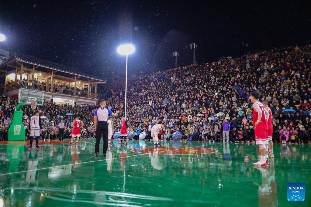 Artists dance prior to a basketball game between Team Tongren and Team Qiandongnan held in Taipan Village, Taijiang County, southwest China's Guizhou Province, March 25, 2023. "Village Basketball Association" or "Village BA", is a grassroot basketball tournament held in Taipan Village. Organized by local residents, this event has gained popularity over the years and draws a large crowd of spectators and participants alike. The tournament showcases the passion and skills of basketball players from rural areas, as they compete and demonstrate their teamwork on the court. (Xinhua/Liu Xu)