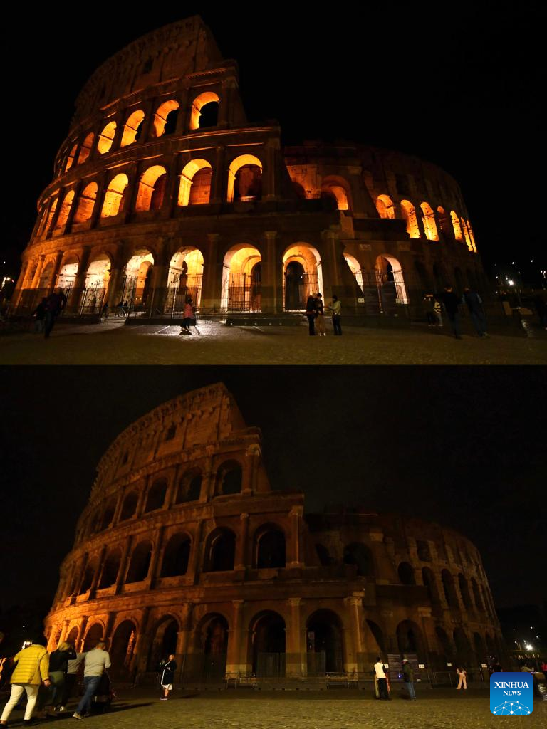 This combo photo shows the Colosseum before the Earth Hour event (above) and during the event in Rome, Italy, March 25, 2023. Earth Hour is a worldwide movement organized by the World Wide Fund for Nature. The event is held annually, encouraging individuals, communities, and businesses to turn off non-essential electric lights, for one hour, from 8:30 p.m. to 9:30 p.m. on the last Saturday of March, as a symbol of commitment to the planet. (Xinhua/Jin Mamengni)