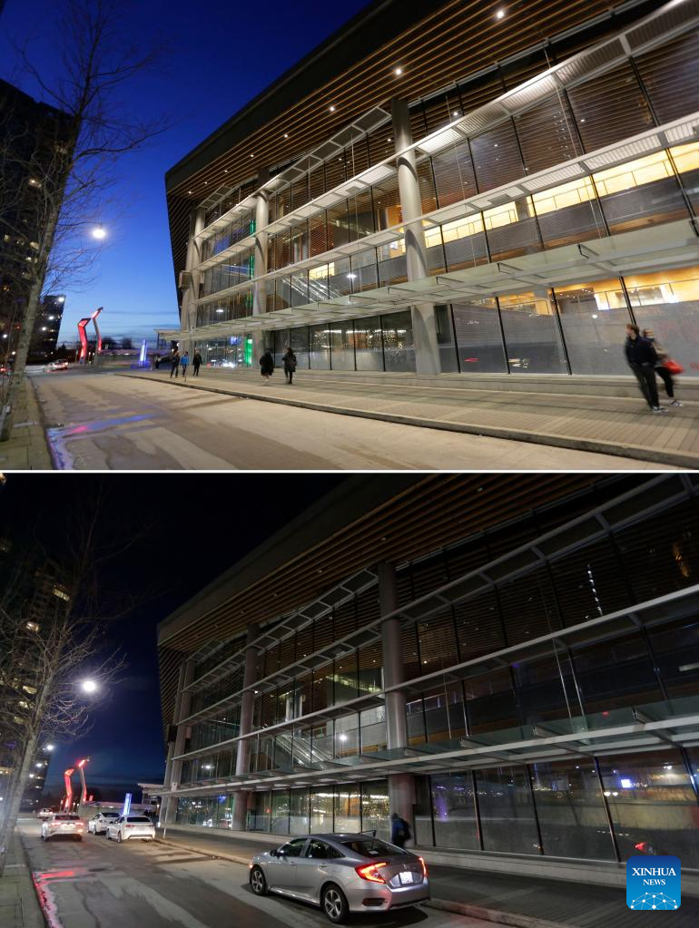 This combo photo shows the Vancouver Convention Centre before the Earth Hour event (above) and during the event in Vancouver, British Columbia, Canada, March 25, 2023. Earth Hour is a worldwide movement organized by the World Wide Fund for Nature. The event is held annually, encouraging individuals, communities, and businesses to turn off non-essential electric lights, for one hour, from 8:30 p.m. to 9:30 p.m. on the last Saturday of March, as a symbol of commitment to the planet. (Photo by Liang Sen/Xinhua)