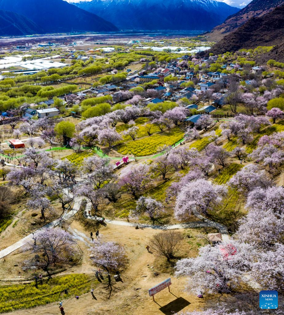 This aerial photo taken on March 24, 2023 shows peach blossoms in Gala village of Nyingchi, southwest China's Tibet Autonomous Region. (Xinhua/Jiang Fan)