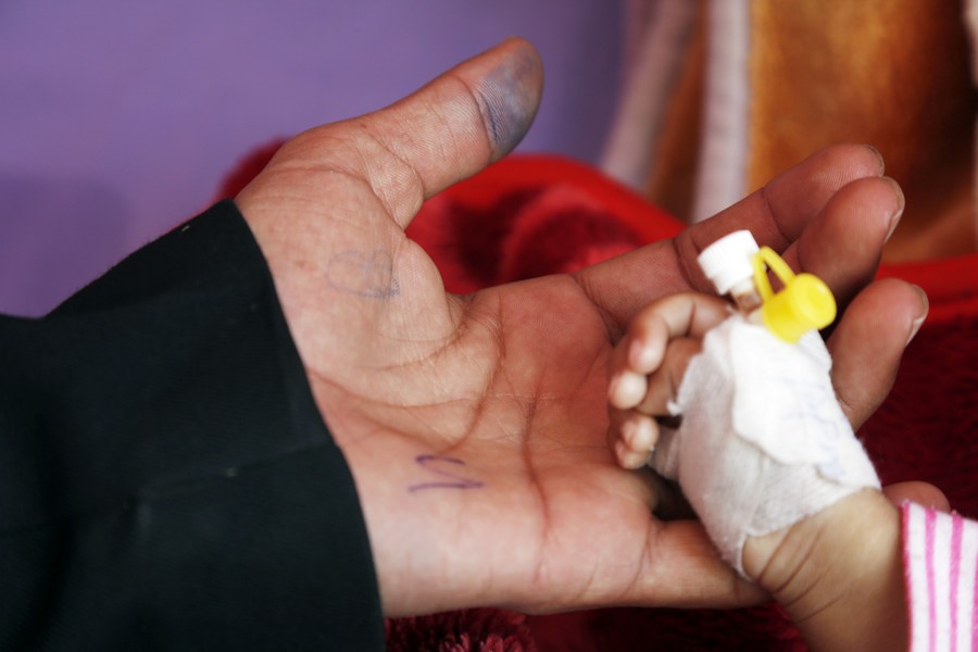 A Yemeni health worker holds the hand of a malnourished child at a hospital in Sanaa, Yemen, Feb. 27, 2023. (Photo by Mohammed Mohammed/Xinhua)