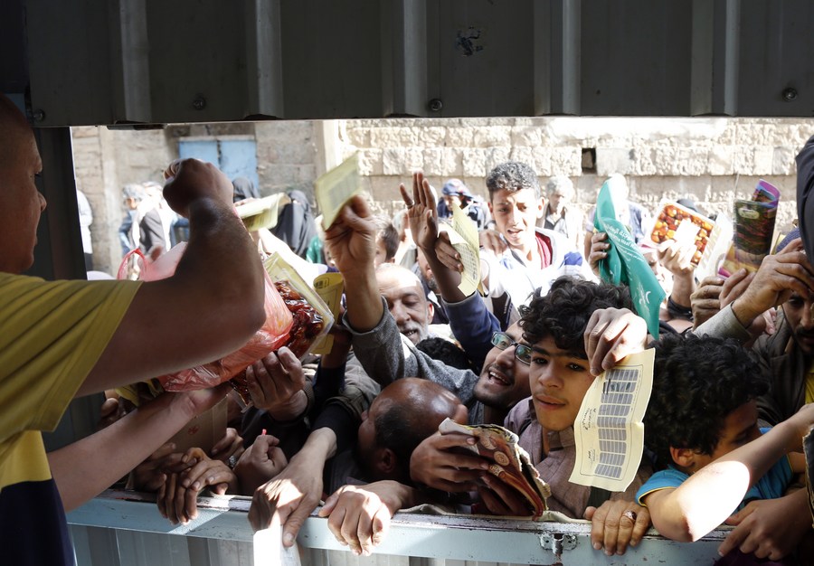 People wait to receive rationed food at a charity center in Sanaa, Yemen, March 23, 2023. (Photo by Mohammed Mohammed/Xinhua)