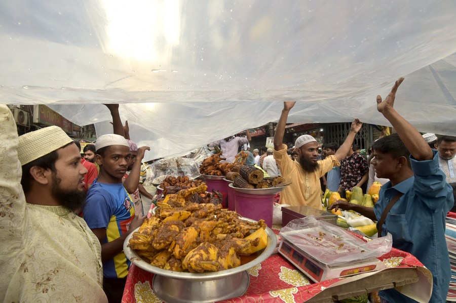 Vendors use plastic fabric to shelter Iftar food items from rain at the Chawkbazar market during the holy month of Ramadan in Dhaka, Bangladesh on March 24, 2023. (Xinhua)