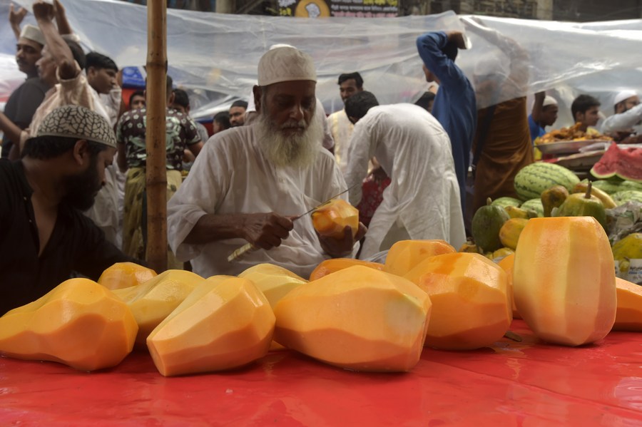 A vendor sells peeled papayas at the Chawkbazar market during the holy month of Ramadan in Dhaka, Bangladesh on March 24, 2023. (Xinhua)