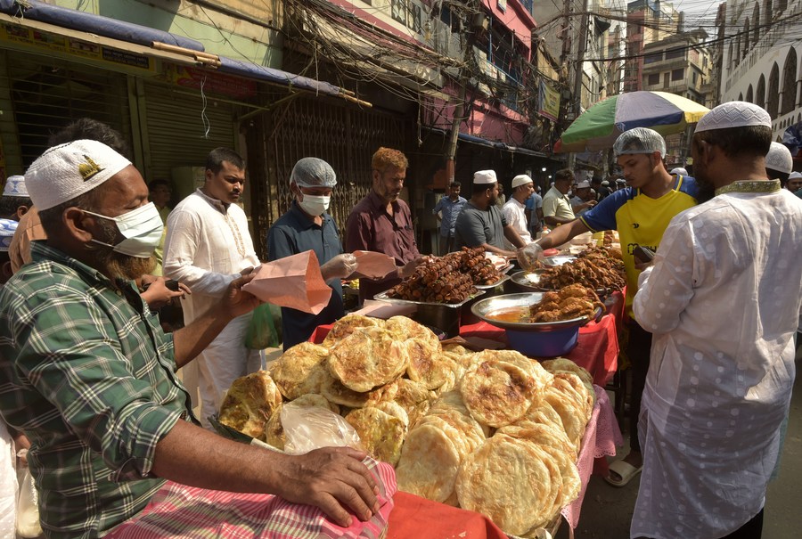 Iftar food items are seen at the Chawkbazar market during the holy month of Ramadan in Dhaka, Bangladesh on March 24, 2023. (Xinhua)