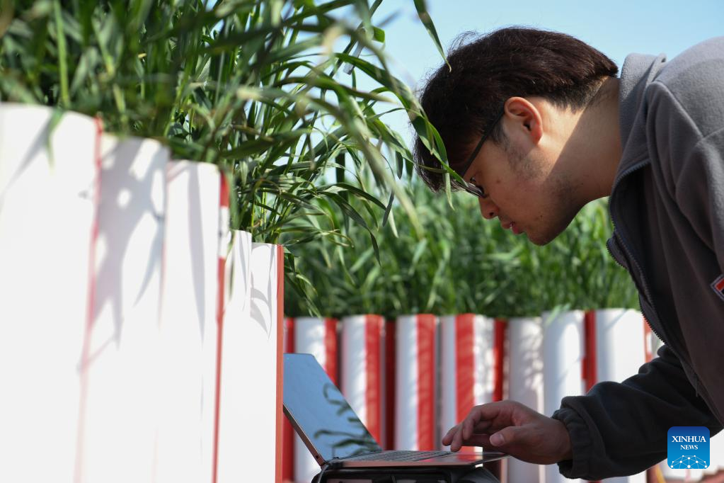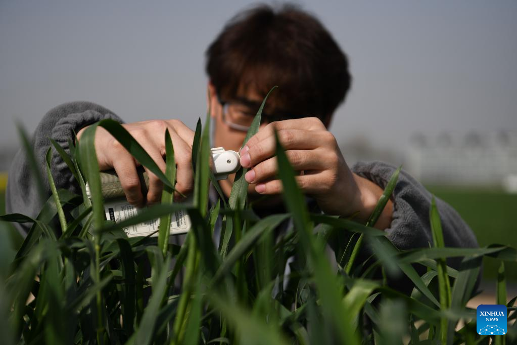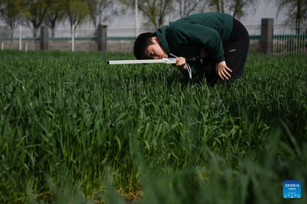 A student of Anhui Agricultural University measures wheat growth at an agricultural experimental base in Hefei, east China's Anhui Province, March 26, 2023. As spring has come, students of Anhui Agricultural University have been studying and practicing at the university's agricultural experimental base. (Xinhua/Zhang Duan)