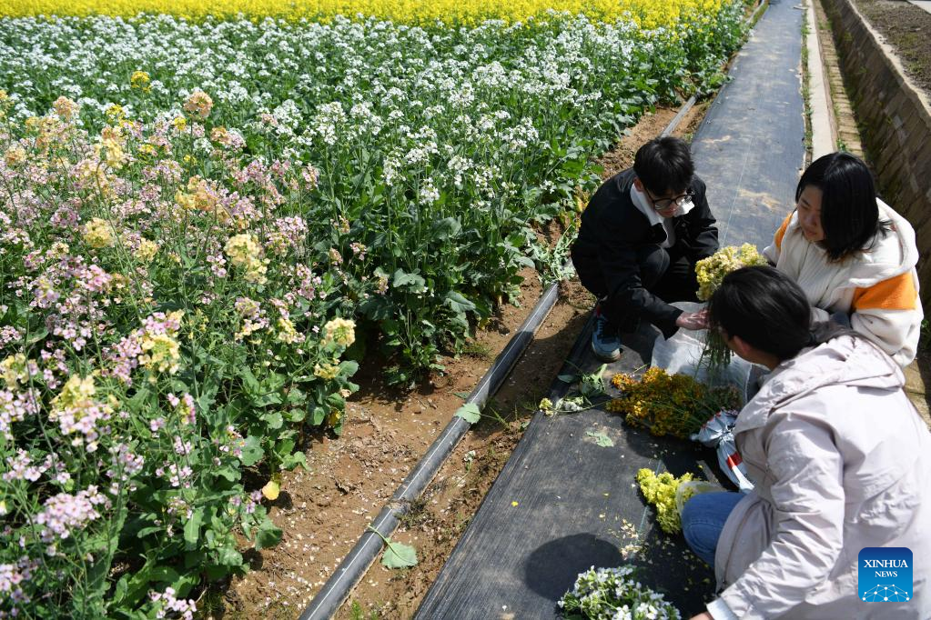 Students of Anhui Agricultural University collect cole samplings at an agricultural experimental base in Hefei, east China's Anhui Province, March 26, 2023. As spring has come, students of Anhui Agricultural University have been studying and practicing at the university's agricultural experimental base. (Xinhua/Zhang Duan)